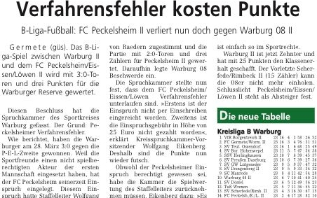 Diesem Einspruch hatte Staffelleiter Wolfgang von Raedern zugestimmt und die Partie mit 2:0-Toren und drei Zählern für Peckelsheim II gewertet. Daraufhin legte Warburg 08 Beschwerde ein.