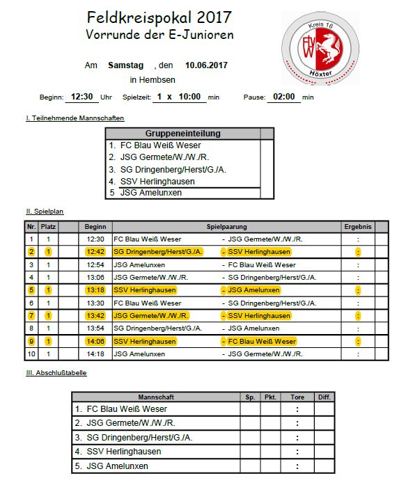 Am Samstag den 10.06.2017 findet beim TuS Hembsen die Vorrunde des Jugend-Feldkreispokal 2017 statt.
