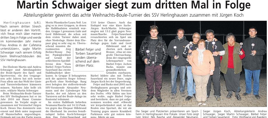 Martin Schwaiger und Jürgen Koch gewinnen das 8. Weihnachts-Boule-Turnier des SSV Herlinghausen.