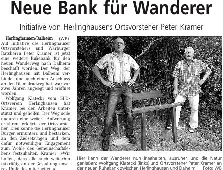 Auf Initiative des Herlinghäuser Ortsvorstehers und Warburger Ratsherrn Peter Kramer ist jetzt eine weitere Ruhebank für den neuen Wanderweg nach Dalheim beschafft worden. Der Weg, der Herlinghausen mit Dalheim verbindet und auch einen Anschluss an den Diemelradweg hat, war vor zwei Jahren angelegt und eröffnet worden.