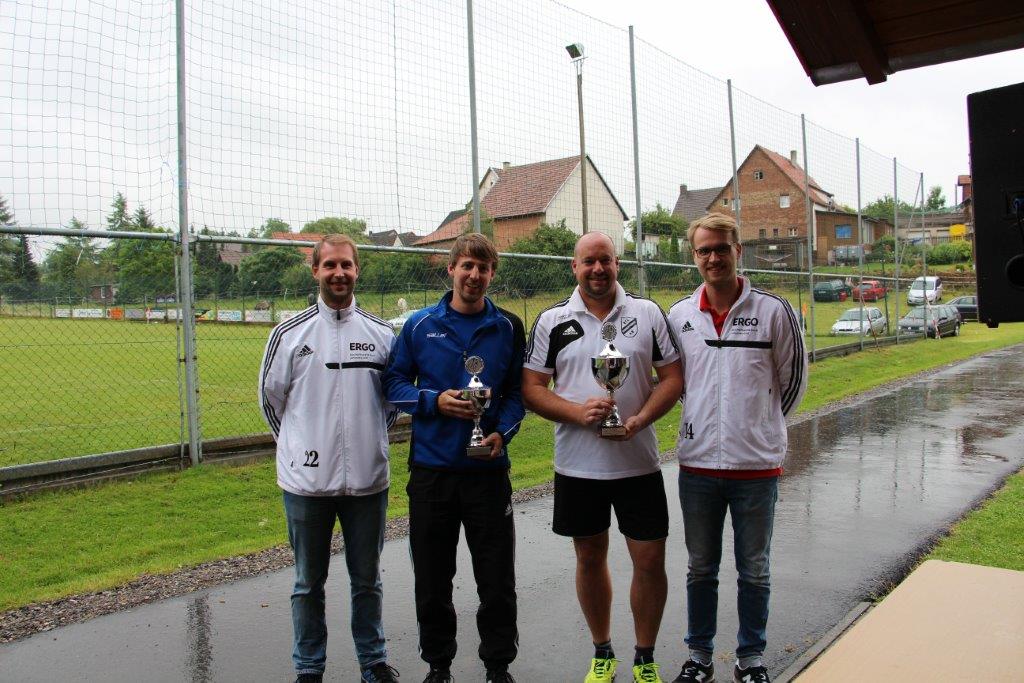 Alexander Neumann (2. Vors., links) und Johannes Gehl (Sponsor der Besitzpokale, rechts) überreichen die Siegerpokale an Stephan Demmrich (FC Germete/Wormeln), Alexander Brunsch (VfL Simmershausen)
